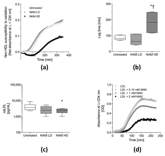 Antioxidant effects of NAM on ApoE-deficient mice. Two-month-old male ApoE-deficient mice were challenged with a Western diet and NAM for 1 month. (a) Representative diene formation curves of non-HDL particles. (b) Median diene formation lag time calculated from the oxidation curves (n = 3–4 plasma pools/group). (c) Serum oxLDL concentration (.n = 8 per group). (d) Oxidation curves of human LDL incubated at NAM concentration 0.10 mM and 1.0 mM. This experiment was replicated twice with similar outcomes. Oxidation kinetics were carried using plasma lipoproteins isolated by sequential ultracentrifugation from pools of 2–3 mouse plasmas of each experimental group, panels (a,b), or pooled human plasma, panel (d), as appropriate. In panels (b,c), data are expressed as medians (interquartile ranges). Statistically significant differences among groups for each variable were determined using a nonparametric a Kruskal–Wallis test followed by Dunn’s posttest. Differences were considered significant when p < 0.05. Specifically, * p < 0.05 vs. Untreated group or † p < 0.05 vs. NAM LD-treated mice. Abbreviations used: NAM LD, low-dose, NAM-treated mice; NAM HD, high-dose, NAM-treated mice; OD, optical density.
