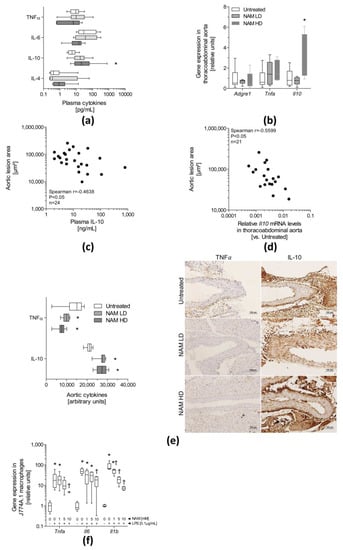 Anti-inflammatory effects of NAM on ApoE-deficient mice and cultured macrophages. Two-month-old male ApoE-deficient mice were challenged with a Western diet and NAM for 1 month. (a) Plasma concentration of cytokines (TNFα, IL-6, IL-10, and IL-4) in ApoE-deficient mice (n = 5–6). (b) Relative aortic mRNA levels of inflammatory targets. (c) Correlation between the area of proximal aortic lesions and circulating IL-10 levels. (d) Correlation between the area of proximal aortic lesions and Il10 aortic mRNA levels. (e) Immunohistochemical (IHC) analysis of TNFα and IL-10 levels in the aorta. Left panel, bar chart showing the relative (arbitrary units) expression of TNFα and IL-10 in the aortas from different groups (n = 5–6 mice per group). Right panel, representative images of immunohistochemical staining for IL-10 and TNFα in thoracoabdominal aortas. (f) Relative mRNA levels of cytokines assessed in LPS-activated J774A.1 macrophages exposed to different doses of NAM for 24 h. Data are expressed as the median (interquartile range) of 4 independent experiments. In panels (a,b,e), data are presented as medians (interquartile ranges) (n = 5–6 samples/group) and from 4 independent experiments in panel F. Statistically significant differences among groups for each variable were determined using a nonparametric a Kruskal–Wallis test followed by Dunn’s posttest. Differences were considered significant when p < 0.05. Specifically, * p < 0.05 vs. Untreated group or † p < 0.05 vs. NAM HD-treated mice. In panels (c,d), the relationship between parameters was tested using a nonparametric Spearman’s correlation test. Mice of all groups were considered for analysis. Abbreviations used: LPS, Lipopolysaccharide; NAM, nicotinamide; NAM LD, low-dose, NAM-treated mice; NAM HD, high-dose, NAM-treated mice.