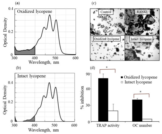 Oxidized lycopene inhibits osteoclast differentiation. Characteristic absorption spectrum of the oxidized lycopene (a) and intact lycopene (b) used in the experiment. (c,d) RAW264.7 cells (4 × 104 cells/well) were incubated either alone or in the presence of RANKL (20 ng/mL) without lycopene or with one of its two types at a concentration of 10 µM. (c) Photographs of cells after staining for tartrate resistant acid phosphatase- (TRAP)-positive cells (original magnification × 100). (d) Counting of multinucleated TRAP-positive cells and measurement of TRAP activity. Values are the means ± SD of three experiments, each performed in triplicate. * p < 0.01 for the difference between the % inhibition with oxidized lycopene vs. intact lycopene.