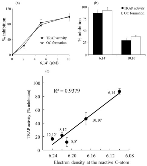Diapocarotene-dials inhibit RANKL-induced osteoclastogenesis. Osteoclast differentiation was measured as described in the Materials and Methods section and in Figure 1. Cell were incubated with RANKL alone or with (a) different concentrations of the diapocarotene-dial 6,14′ or (b,c) with 10 µM different diapocarete-dials. Inhibition is shown in relation to positive control with RANKL. (b) Comparison of the inhibition by 6,14′ and 10,10′. Values are the means ± SE of 3–14 experiments, each performed in triplicate, p < 0.01 for the difference between the % inhibition with 6,14′ vs. 10,10′. (c) Correlation between the electron density at the reactive C-atom of the various diapocarotene-dials and the % inhibition of osteoclast TRAP activity. Values are the means ± SE of 3–11 independent experiments, each performed in triplicate. The results are statistically significant (ANOVA test) p < 0.05.