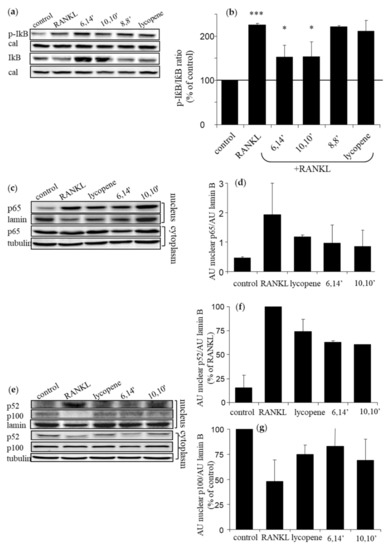 Degradation of the precursor p100 to the active NF-κB component p52 is essential in activating the alternative pathway. RANKL reduced the nuclear level of p100 and increased that of p52 (Figure 3e–g). Treatment with lycopene, 6,14′ and 10,10′ suggests inhibition of the RANKL-induced conversion of p100 to p52, but the changes were not significant. In addition, these compounds preserved the cytosolic levels of p52 and prevented its translocation to the nucleus (Figure 3e). These results may suggest that active diapocarotene-dials inhibit both pathways in RANKL-induced NF-κB activation in RAW264.7 cells.