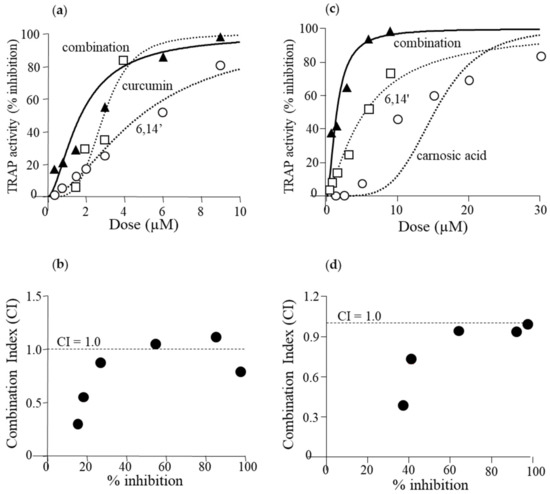 RAW264.7 cells were incubated with combinations of the diapocarotene-dial 6,14′, with the polyphenols curcumin and carnosic acid. At low concentrations of each agent, these combinations produced a synergistic anti-differentiative effect in RANKL-induced cells. Synergistic effects were evaluated using Calcusyn Software for Dose Effect Analysis. Dose effect curves and CI values for the combination of 6,14′ with curcumin (Figure 4a,b) and 6,14′ with carnosic acid (Figure 4c,d) are presented. Most CI values are below 1.0, indicating some synergy at most of the tested concentrations. However, CI values at low concentrations, resulting in 20–40% inhibition, are smaller than 0.5, indicating a strong synergistic effect at concentrations that can be found in human blood.