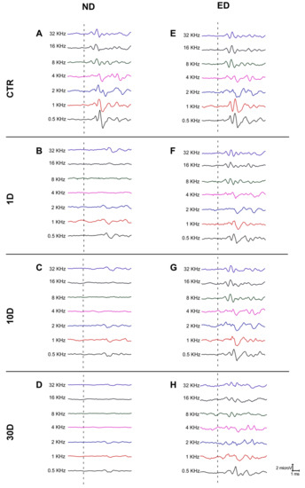 As illustrated in Figure 1, and consistent with previous studies [24,25,34], ABR recordings from both ND-CTR and ED-CTR rats (Figure 1A,E), not exposed to noise, showed the usual pattern of 4 to 5 evoked waveforms following the stimulus onset, where wave II was the largest, followed by waves I, IV, V, and III. Similar to what has been described elsewhere in rats [24,31], ABR recordings carried out at 1 day (Figure 1B), 10 days (Figure 1C), and 30 days (Figure 1D) after noise exposure in the ND rats, showed lack of evoked responses at any time point and frequency evaluated. In contrast, in the ED animals evoked response waves were still present at all frequencies tested and at all time points studied, albeit with reduced amplitudes (Figure 1F–H).