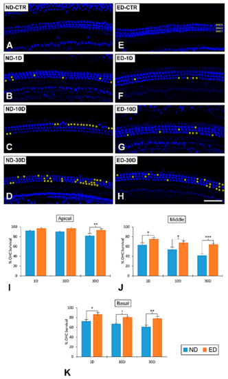 Surface preparation images illustrating DAPI staining in the middle cochlear turn in ND-fed and ED-fed control and noise-exposed animals. There was an increase in hair cells loss at all post-exposure survival times in ND-fed animals (B–D) compared to the control condition (A). Following oral administration of ACEMg (E–H), there was an increase in hair cell survival in comparison to non-treated animals at the same survival time. Yellow asterisks show loss of OHCs at 1D, 10D, and 30D postexposure. (I–K) Bar graphs illustrating percentage of OHC loss following noise exposure and oral ACEMg treatment. In the apical cochlear turn (I), a significant loss of OHCs was evident only in the ND-30D group when compared to ED-30D rats. After noise exposure, in the middle (J) and basal (K) cochlear turns, there was a significant reduction in the number of OHCs at 1, 10, and 30 days in both ND and ED rats. However, in the ED rats OHC loss was significantly lower at all survival times when compared to ND animals. Asterisks indicate significant differences between ND and ED rats. ∗ p < 0.05; ∗∗ p < 0.01, ∗∗∗ p < 0.001. Scale bar = 50 µm is shown in H.