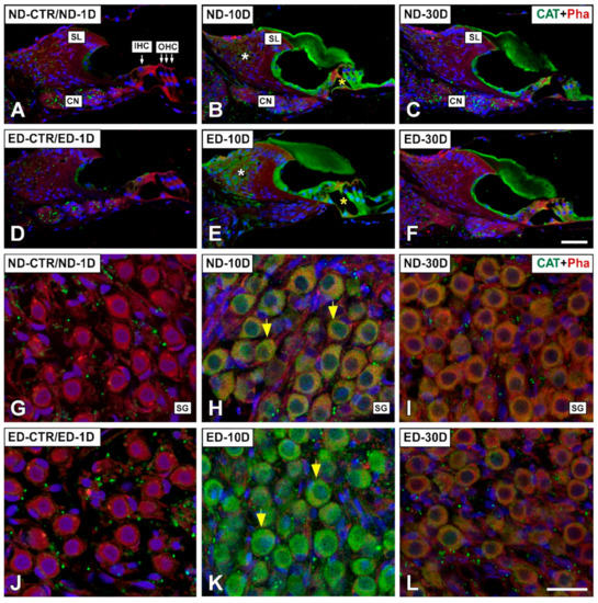Laser confocal microscopy images showing the distribution of CAT immunolabeling in the cochlea of ND and ED-fed rats at 1D, 10D, and 30D after noise-exposure. CAT immunofluorescence is green. Red fluorescence is phalloidin labeling. When compared with the untreated controls (ND-CTR) and the ND-1D group ((A,G) shows an example from a ND-1D animal), under identical antibody incubation conditions CAT-immunostaining was more intense in the organ of Corti (yellow asterisk in B), the spiral limbus (white asterisk in (B)), and the spiral ganglion (yellow arrows in (H)) at 10D post-exposure. The immunostaining intensity was decreased at day 30 after noise exposure although it was still evident in the organ of Corti (C) and the spiral ganglion (I). Following oral administration of ACEMg, immunostaining increased in the noise-exposed cochlea at 10D post-exposure (E,K) when compared to non-treated animals at the same survival time and the ND-1D group (D,J). Note that at 30D post-exposure, the staining intensity between treated (C,I) and untreated (F,L) rats was comparable. Abbreviations: CN, cochlear nerve; IHC, inner hair cell; OHC, outer hair cells; SL, spiral limbus; SG, spiral ganglion. Scale bar = 50 µm in F and 25 µm in (L).