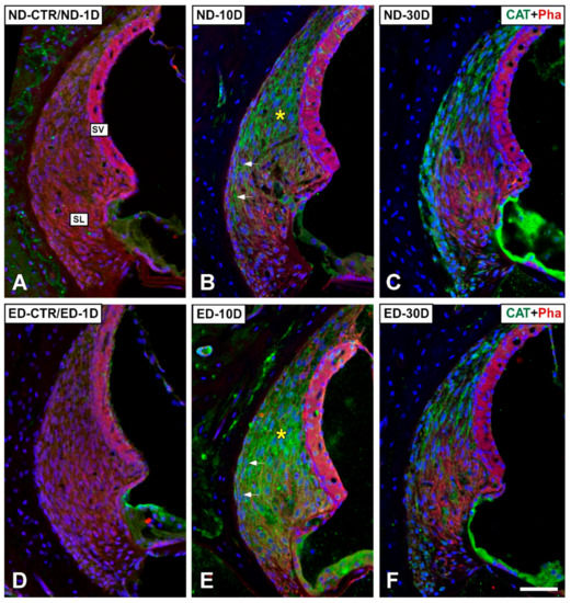 Confocal images showing the distribution of CAT immunolabeling in the lateral wall of ND and ED-fed rats at 1D, 10D, and 30D after noise-exposure. CAT immunolabeling is green. Red is phalloidin staining. When compared with the control, untreated condition and the ND-1D group (A), at 10D post-exposure, immunostaining for CAT was particularly intense in the type I/III fibrocyte region of the spiral ligament (asterisk and arrows in (B)). Oral administration of ACEMg resulted in an increased CAT immunolabeling (arrows and asterisk in (E)) relative to untreated animals (D). At longer survival times (30D post-exposure), there were no apparent differences between untreated (C) and treated (F) rats. Abbreviations: SL, spiral ligament; SV, stria vascularis. Scale bar = 50 µm is shown in F.