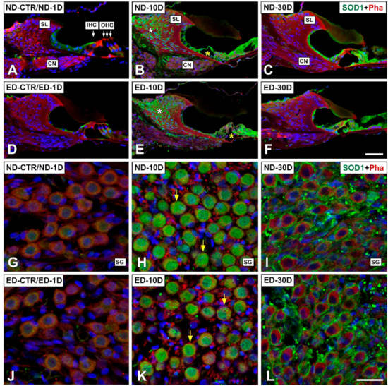 Confocal microscopy images showing the distribution of SOD1 in the cochlea of ND and ED-fed rats at 1D, 10D, and 30D after noise-exposure. Green fluorescence is SOD1 immunolabeling. Red fluorescence is phalloidin staining. Compared with the control untreated condition and the ND-1D group ((A,G) shows an example from a ND-CTR animal), at day 10 post-noise exposure there was an increase in SOD1-immunostaining intensity in the organ of Corti (yellow asterisk in (B)), the spiral limbus (white asterisk in (B)) and the spiral ganglion (yellow arrows in (H)). At 30 days after noise-exposure, immunostaining intensity decreased, although it was still evident in the organ of Corti (C) and the spiral ganglion (I). Following oral administration of ACEMg, there were no differences among untreated and treated groups for any of the cochlear structures analyzed at any of the survival times evaluated (compare (A–C) with (D–F); and (G–I) with (J–L)). Abbreviations: CN, cochlear nerve; IHC, inner hair cell; OHC, outer hair cells; SL, spiral limbus; SG, spiral ganglion. Scale bar = 50 µm in F and 25 µm in L.