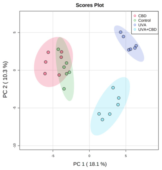 - UVA + CBD group: the skin of the backs of the rats was irradiated with UVA every 48 h as in the UVA group and every 12 h, the backs of the rats were treated with CBD as in the CBD group;
