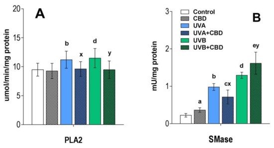 - Magnoni, C.; Euclidi, E.; Benassi, L.; Bertazzoni, G.; Cossarizza, A.; Seidenari, S.; Giannetti, A. Ultraviolet B radiation induces activation of neutral and acidic sphingomyelinases and ceramide generation in cultured normal human keratinocytes. Toxicol. Vitr. 2002, 16, 349–355. [Google Scholar] [CrossRef]