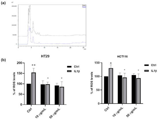 ROS levels were evaluated as previously reported [24]. 3.5 or 2.5 × 103 cell/well (HT29, HCT116 or HUVEC) were seeded in 96-multiwell plates and, after adherence, were maintained for 18 h in medium without phenol red (0.1% serum) with different concentrations of the extract (10 and 50 µM) and then exposed to IL1β (10 ng/mL) for 24 h. DCFH2-DA (2,-7-dichlorodihydrofluorescein diacetate) (Invitrogen, Milan, Italy) was added (10 µM, 1h) and intracellular levels of ROS were evaluated photometrically with a microplate reader (excitation/emission 495/527) (EnVision, PerkinElmer).