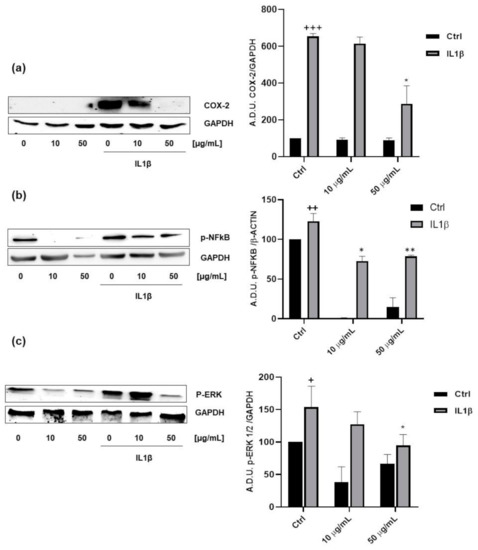 Anti-inflammatory activity of the FV extract. (a) Western blot analysis and quantification of COX-2 expression in HT29 cells after 18 h of exposure with different concentrations of FV extract (10–50 µM) followed by a 24 h incubation with IL 1β (10 ng/mL). +++ p < 0.001 vs. Ctrl, * p < 0.05 vs. IL1β. (b) Western blot analysis and quantification of NFκB phosphorylation in HT29 cells after exposure with FV extract (10–50 µM) followed by incubation with IL 1β (10 ng/mL). ++ p < 0.01 vs. Ctrl, **p < 0.01 vs. IL1β, * p < 0.05 vs. IL1β (c) Western blot analysis and quantification of ERK 1/2 phosphorylation in HT29 cells. (A.D.U.: arbitrary densitometry units). + p < 0.05 vs. Ctrl, * p < 0.05 vs. IL1β. The gels showed in the figure are representative of four independent experiments.