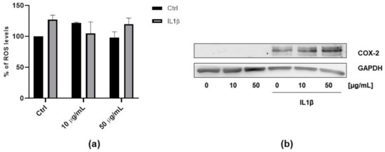 It has been demonstrated that IL1β, a pro-inflammatory cytokine, induces COX-2 expression in colorectal cells and that COX-2 drives colon cancer progression [33,34]. In this context, we evaluated the activity of FV extract on COX-2 expression induced by IL1β. We stimulated HT29 cells with IL1β (10 ng/mL, 48 h), in presence of 10 and 50 µg/mL of FV extract and we observed that at the higher concentration FV extract was able to strongly inhibit IL1β-induced COX-2 expression (Figure 4a). These data clearly indicate that FV extract could reduce the inflammation related to cancer.