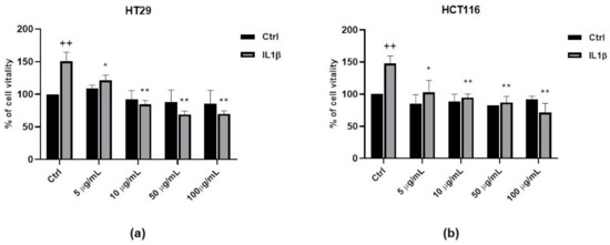 FV extract inhibits colon cancer cell growth. Cell proliferation induced by IL 1β (10 ng/mL) in the presence or absence of FV extract (5, 10, 50 and 100 µg/mL) was measured by MTT assay. HT29 (a) and HCT116 (b) cells were exposed to IL 1β for 48h. Data are reported as % of cell viability and are the means of 4 experiments run in triplicate. ++ p < 0.01 vs. Ctrl, * p < 0.05 and ** p < 0.01 vs. IL 1β.