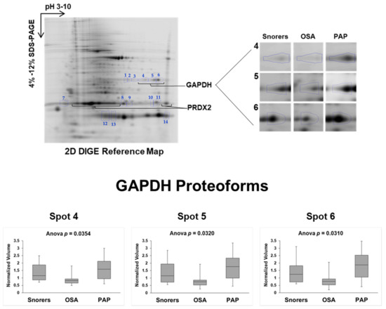 Two dimensional difference gel electrophoresis (2D-DIGE) reference map of hemoglobin-depleted red blood cells (RBCs) from Snorers subjects and Obstructive Sleep Apnea (OSA) patients before and after positive airway pressure (PAP) treatment. Fourteen protein/proteoforms spots differentially abundant (fold change ≥ 1.2; Anova p < 0.05) among Snorer RBC and OSA RBC before and after six months of PAP treatment are numbered and indicated with circles on the reference mini 2D-DIGE map image displayed. The MS characterization of these proteins is fully described in Figure 2 and Table S2, Supplementary Materials. Three proteoforms of glyceraldehyde-3-phosphate dehydrogenase (GAPDH), corresponding to spots 4–6 on the 2D-DIGE, were identified significantly decreased in OSA RBC that after six months of PAP treatment increased to the Snorer levels as shown by the respective graphical representations of spot normalized volume profile among the analyzed groups (shown at the bottom of the figure). Graphical representation of all identified spot-proteins as differentially abundant among the groups under study is shown in Figure S1 (see Supplementary Materials).