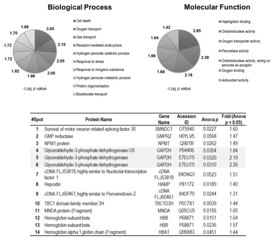 Gels were scanned at 100 µm resolution using an Amersham Biosciences Typhoon 8400, variable imager to obtain IS (Cy3) image and sample (Cy5) image as we previously described [11,15]. Spot detection, gel matching, and statistical analysis were performed by the Progenesis SameSpots, version 4.5 (Nonlinear Dynamics, UK). Abundance values of matched spots across all mini gel images, expressed as normalized volume, were compared between conditions, so that each spot could be assigned a score of relative significant difference in terms of p-value (<0.05). The relative content alteration of each spot across the study conditions was expressed by fold change values, which were calculated by the ratio of the mean normalized volumes of a certain spot in each condition. Spots decreasing their abundance were represented by negative fold values, which were calculated as the inverse of the previous ratio multiplied by −1.