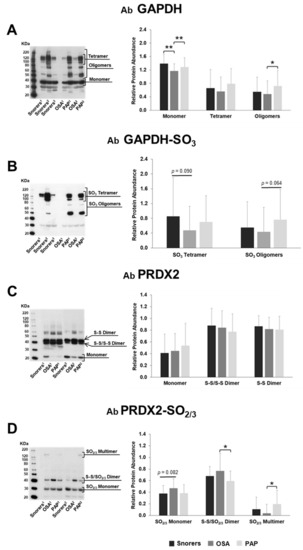In addition to the monomeric form (37 kDa), several oligoforms of GAPDH from 50 to 200 kDa, which includes the tetrameric form (≈150 kDa), were also detected (Figure 3A). The abundance of these oligoforms, specifically the abundance of GAPDH monomer (37 kDa), was shown to be significantly decreased in OSA RBC compared to Snorer RBC. After PAP treatment, the abundance of this monomeric form significantly increased in OSA RBC to the levels comparable to the ones observed in Snorer RBC (Figure 3A). These results corroborate the 2D-DIGE proteomic data (Figure 1). All these GAPDH oligoforms but not the monomeric ones were recognized by the antibody for SO3 GAPDH, indicating the presence of sufinylation–sulfonylation oxidation modification in these oligoforms (Figure 3B). PAP treatment seemed to induce the increase of oxidation modification in GAPDH tetrameric or oligomeric forms but with p-value not sufficient to reach statistical significance (Figure 3B).