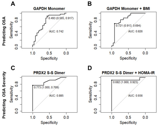 Receiver Operating Characteristic (ROC) curves for the models using GAPDH and PRDX2 to classify patients at risk for OSA or OSA severity. The different redox–oligomeric forms of GAPDH or PRDX2 were used as predictors in logistic regression models and Receiver Operating Characteristic (ROC) curves were used to assess their potential discriminative power in classifying patients at risk for OSA or as predictor of OSA severity. The best results to predict patients at risk for OSA were obtained for the GAPDH monomer alone (AUC: 0.742; 0.917 sensitivity; and 0.565 specificity) (A) or combined with Body Mass Index (BMI) parameter (AUC: 0.826; 0.694 sensitivity; and 0.913 specificity) (B). The best results to discriminate severe OSA from mild–moderate OSA were obtained for the PRDX2 S-S Dimer alone (AUC: 0.885; 0.769 sensitivity; and 1.000 specificity) (C) or combined with the homeostatic model assessment for insulin resistance (HOMA-IR) metabolic parameter (AUC: 0.936; 0.923 sensitivity; and 1.000 specificity) (D). The respective optimal cut-off values and the specificity and sensitivity values (within parenthesis) are displayed in the plots.