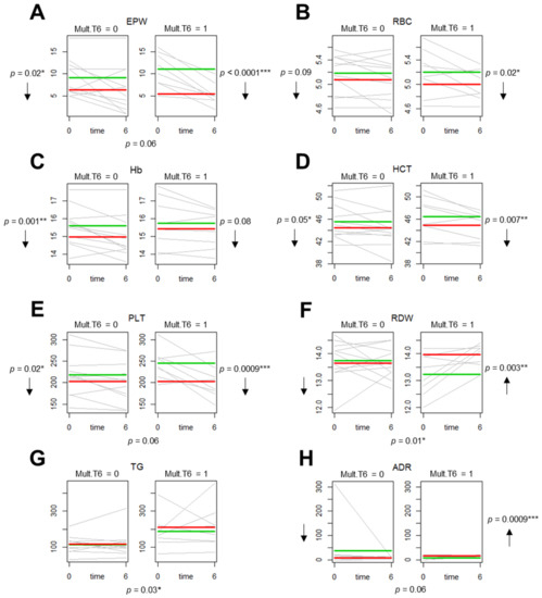 Spaghetti plot displaying clinical parameter data evaluated in two subgroups of OSA patients before (t0) and after six months of PAP treatment (t6). The OSA subgroup with (pred.mult = 1) and without (pred.mut = 0) induced PRDX2 SO2/3 multimer after six months of PAP treatment were compared by evaluating the clinical parameters under study at time t0 and t6, using Logistic GEE regression models. The most significant data were obtained for EPW (A), RBC (B), Hb (C), HCT (D), PLT (E), RDW (F), TG (G) and ADR (H) clinical parameters as shown. Green line indicates the average value of a clinical parameter at t0, and the red line indicates the average value of this clinical parameter at time t6.