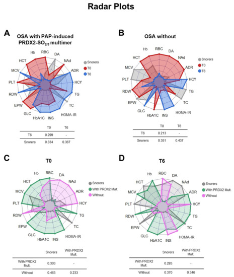 The study clinical parameters are displayed in one dimension comparing the OSA subgroup with (A) or without PAP-induced PRDX2-SO2/3 response (B), measured at time t0 (T0, red) and t6 (T6, blue) with the Snorer group as a control reference (gray); or OSA subgroup with (green) and without PAP-induced PRDX2-SO2/3 response (rose) at t0 (C) and t6 (D) with the Snorer group as a control reference (gray). Each clinical parameter is represented on a different radius of a radar plot. The centroid points in the periphery represented the highest average value, whereas the centroid points in proximity to the center corresponded to the lowest average value for a clinical parameter. The similarities between the different groups at different conditions are measured by the Gower similarity measure (the closer to 1, the more similar the groups) and the results indicated at the bottom to each corresponding radar plot.