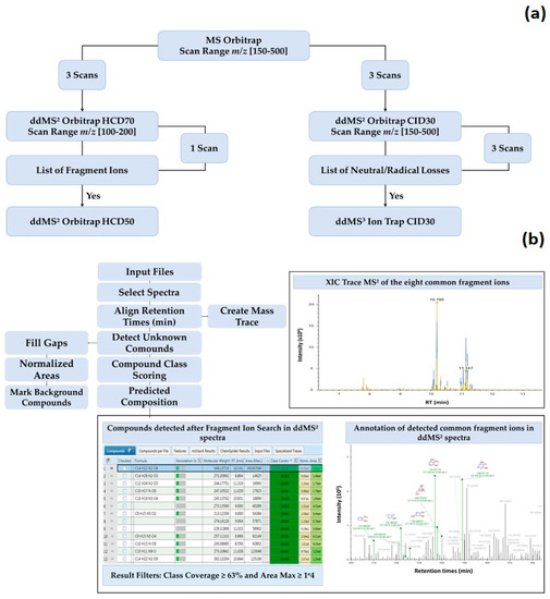 Flowchart of the developed untargeted screening approach of MAAs using an Orbitrap MS based on data-dependent MS2/MS3 Acquisition (a). Untargeted workflow designed on Compound DiscovererTM to flag putative MAAs in algal extracts (b). Description of the role of the following nodes: Compound Class Scoring: Calculation of the percentage of common fragment ions detected in mass spectral data of every compound in the result table. Predicted Composition: Proposition of chemical formula for unknown compounds. Create mass Trace: Create mass chromatogram of compounds for which common fragment ions were detected in their mass spectral data. Fill Gaps: Indication of missing peaks or peaks below the detection threshold. Normalize Areas: Normalization of chromatographic peaks. Mark Background Compounds: Identification of compounds in blanks.