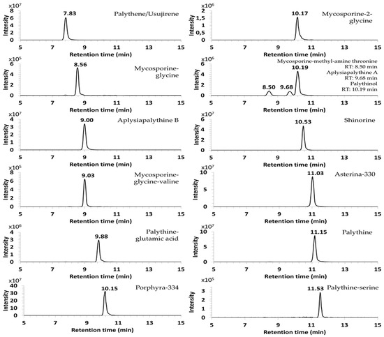 The separation efficiency of MAAs and their ionization conditions were optimized using ammonium acetate solution at 5 mM and pH 6.5 [14,15]. In these conditions, 14 candidate-MAAs were separated between 7 and 12 min.