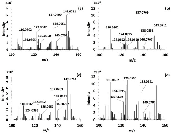Although the fragmentation at CID30 permitted to identify the fragment ion m/z 186.0999 specific of imino-MAAs [28,30], no common fragment ion was detected between imino- and oxo-MAAs. Indeed, low collision energies permitted only to describe the first steps of their radical fragmentation pathway targeting exclusively their substituents. An optimization of the fragmentation conditions at HCD70 allowed to produce, as it is shown in Figure 4 six common fragment ions among the four purified MAAs: m/z 110.0602, m/z 122.0602, m/z 124.0395, m/z 126.0550, 138.0551 and m/z 140.0707. Besides, mass spectral data of the three imino-MAAs showed two characteristic high intense fragment ions: m/z 137.0709 and m/z 149.0711 (Figure 4a–c).