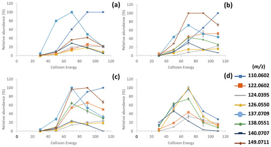 Relative abundance of characteristic fragment ions of MAAs depending on collision energies in MS2 of palythine (a), porphyra-334 (b), shinorine (c) and mycosporine-serinol (d).