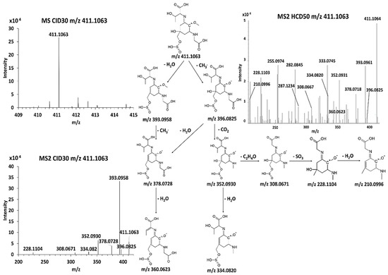 The most intense fragment ion observed in the CID30 MS2 spectrum of the candidate-MAA m/z 411.1063 was m/z 393.0958. This result supported the hypothesis that the radical elimination pathway, specific to the MAAs, could compete with secondary fragmentation routes. The priority choice of a given fragmentation pathway depends on the presence and the number of functional groups on their amino acids substituents such as hydroxyl or carboxylic groups [29]. The observation of the neutral loss SO3 (79.95 Da) suggested for the first time the occurrence of sulfated MAAs. This neutral loss was also observed for the candidate-MAA m/z 367.1164. The multistage fragmentation pathways of six other MAAs were detailed in Figure S6a–f.