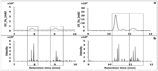 Screening of MAAs in the model alga Gymnogongrus devoniensis. UV Trace of MAAs recorded at (300–360) nm (a). XIC Trace MS2 of the set of eight fragment ions by ddMS2/MS3 untargeted analysis (b). All the peaks observed in the XIC trace MS2 indicate all the retention times for which MAAs were detected in the extract.