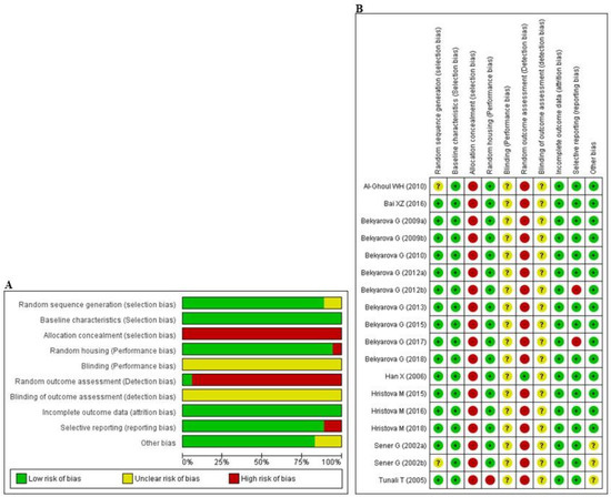 The abridged risk of bias (RoB) assessment is presented in Figure 2A, and the individual RoB scores of each study are shown in Figure 2B. Experimental animals in most of the studies had randomly allocated, and maintained under unified room temperature, humidity, and food supply. However, allocation concealment and random outcome assessment were not described, resulting in a high risk of selection and detection bias, respectively, in all studies. In addition, the issue of selective reporting was not discussed in two studies [64,68], suggesting that they may have had a high level of reporting bias. All of the studies reported that the animals were of similar weight and underwent the same experimental design at baseline. Inadequate reporting of the measures used to decrease bias was captured by our RoB assessment; in numerous cases, the measures used were unclear.
