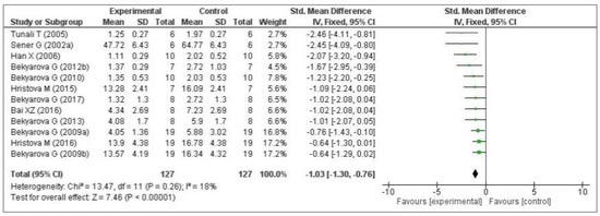 Thirteen of the included studies measured the malondialdehyde (MDA) level. Of these 13 studies, 1 [74] did not provide the number of samples per group and was therefore eliminated from the meta-analysis. Of the remaining 12 studies, five measured the MDA level in the liver [64,66,68,69,70], three in the gastric mucosa [71,72,73], one in the kidneys [75], two in the plasma [76,77], and one in the lungs [79]. The data of the 12 eligible studies are shown in Figure 3. Compared with the control group, MT significantly decreased the level of malondialdehyde (standardized mean difference [SMD], −1.03; 95% confidence interval [CI], −1.30, −0.76, p < 0.00001). This effect size was robust according to the sensitivity analysis, i.e., the omission of individual studies did not abolish the significance (Supplementary Figure S1).