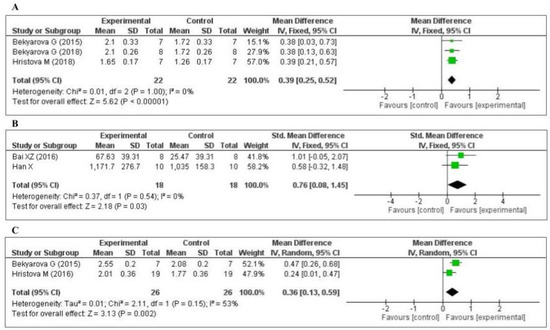 Three studies [45,63,65] measured the nuclear factor erythroid 2-related factor 2 (Nrf2) level: two in the liver and one in the gastric mucosa. The data of the three studies are shown in Figure 5A. MT increased the level of Nrf2 (MD, 0.39; 95% CI, 0.25, 0.52, p < 0.00001). Two studies [75,79] measured the tissue superoxide dismutase (SOD) level: one in the kidney and one in the lung. The data of the two studies are shown in Figure 5B. MT significantly decreased the level of SOD (SMD, 0.76; 95% CI, 0.08, 1.45, p = 0.03). Two studies [65,71] measured the tissue heme oxygenase-1 (HO-1) level: one in the liver and one in the gastric mucosa. The data of the two studies are shown in Figure 5C. MT increased the level of HO-1 (MD, 0.36; 95% CI, 0.13, 0.59, p = 0.002). The effect sizes were robust according to the sensitivity analysis, i.e., the omission of individual studies did not abolish the significance (Supplementary Figures S4–S6).