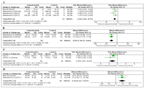 Four of the included studies measured the tumor necrosis factor-α (TNF-α) level: three [64,66,67] in the liver and one [75] in the kidney. The data of the four studies are shown in Figure 6A. MT significantly decreased the level of TNF-α (SMD, −1.34; 95% CI, −1.92, −0.77, p < 0.00001). Two of the studies measured the plasma C-reactive protein (CRP) level [69,76]. The data of the two studies are shown in Figure 6B. MT significantly decreased the level of CRP (MD, −12.67; 95% CI, −16.72, −8.62, p < 0.00001). Two of the studies measured the myeloperoxidase (MPO) level [70,79]. The data of the two studies are shown in Figure 6C. MT significantly decreased the level of MPO (SMD, −1.19; 95% CI, −1.97, −0.41, p = 0.003). Finally, two of the studies measured the tissue interleukin-10 (IL-10) level [64,75]: one in the liver and one in the kidney. The data of the two studies are shown in Figure 6D. MT significantly decreased the tissue level of IL-10 (MD, 9.10; 95% CI, 4.22, 13.97, p = 0.0003). The effect sizes were robust according to the sensitivity analysis, i.e., the omission of individual studies did not abolish the significant effect (Supplementary Figures S7–S10).