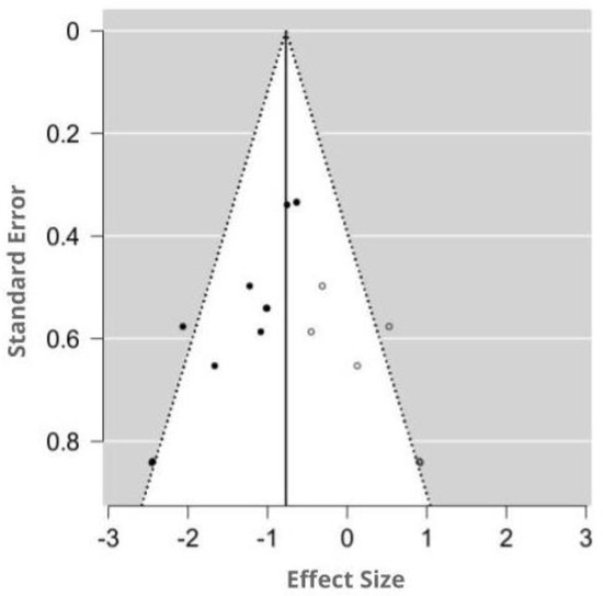 Based on the Cochrane recommendations, we analyzed funnel plot asymmetry when one outcome variable was associated with at least 10 studies in the meta-analysis, since with <10 studies the power of the tests is too low [60]. Potential publication bias was assessed by visual inspection of funnel plot asymmetry and Egger’s test of asymmetry [61]. Whenever asymmetry was detected in the funnel plot, the trim and fill method was used to calculate the effect size by estimating the number of missing studies [62]. All statistical analyses related to publication bias were carried out in JASP, an open-source statistical program developed by the University of Amsterdam (https://jasp-stats.org/).