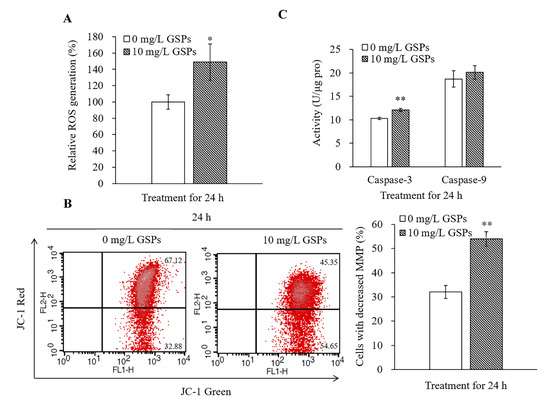 3.3. GSPs Trigger ROS Production, Decrease the MMP, and Increase the Caspase-3 Activity of HepG2 Cells