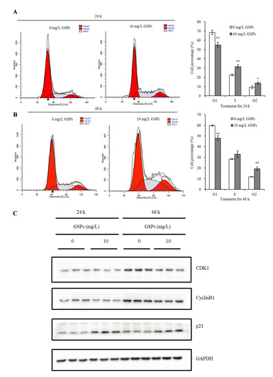 3.4. GSPs Induce G2/M Phase Cell Cycle Arrest of HepG2 Cells