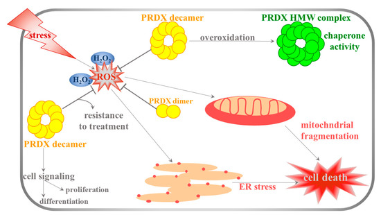 Functions of proxiredoxins (PRDXs) in the cell. Increased level of ROS triggers mitochondrial fragmentation and endoplasmic reticulum (ER) stress which leads to cell death. PRDXs protect cells by ROS scavenging. Most PRDXs form decamers or, upon overoxidation, high-molecular-weight (HMW) complexes which gain chaperone activity. In cancer cells, high levels of PRDXs contribute to resistance to treatment. Apart from ROS scavenging activity, PRDXs may be implicated in cell signaling, differentiation and proliferation.