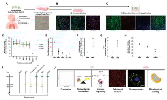 Validation of physiological response of Cystic Fibrosis (CF) derived differentiated airway epithelium model to LPS challenge. (A) Airway basal epithelial cells from four CF donors were used to create conditionally reprogrammed airway epithelial cells (CREC). (B) CRECs were cultured under 2D-conventional condition which formed epithelial monolayers that retain their epithelial cobblestone morphology (positive E-Cadherin (green), ZO-1 (red), and p63 (red) staining) and no detectable signal for mesenchymal cell marker vimentin (VIM; red). (C) Alternatively, CRECs were cultured in 3D terminally differentiated pseudostratified epithelium at air liquid interface (ALI) with mucociliary differentiation (ciliated cell marker Ac-Tubulin (green) and E-cadherin (red)). (D) Treatment of epithelial cultures with GGC, NAC, and GSH for 24 h in a range of concentration (2 to 2000 µM) shows low cytotoxicity. DMSO was used as positive cell death control. Cytotoxicity was observed as a reduction in metabolic viability measured by MTT assay. (E) Total intracellular glutathione levels increase with 50 µM GGC but not 50 µM of NAC or GSH. Exposure of epithelial cultures to 100 ug/mL of Pseudomonas aeruginosa derived lipopolysaccharide (LPS) for 24 h show significant increase in (F) oxidative stress and (G) inflammation via a four-fold increase in pro-inflammatory cytokine IL-8 and (H) increased cytotoxicity. (I) Treatments used to explore the potential efficacy of GGC against Pseudomonas aeruginosa derived lipopolysaccharide (LPS) included: (1) PBS control (Mock), (2) LPS-challenged (LPS+), (3) GGC added 24 h post-LPS challenge (therapeutic, T), (4) GGC added 24 h prior to LPS challenge (prophylactic, P), (5) GGC added 24 h prior and 24 h post LPS challenge (T+P); and (6) GGC alone. (J) Proteomics, antioxidant, and pro-oxidant, inflammatory response, cell morphology and metabolic viability analyses were carried out 24 h post-infection for each treatment condition in primary differentiated human airway epithelial cells (HAEC) of either bronchial (HBEC) or nasal (HNEC) origin. Statistical analysis was performed using one-way ANOVA against the PBS control. (* = p < 0.05, ** = p < 0.01, *** = p < 0.001, **** = p < 0.0001). Error bars represent SD. Data are from at least three primary airway CF (DF508/DF508 CFTR) epithelium cultures, with three technical replicates for each different experimental condition.