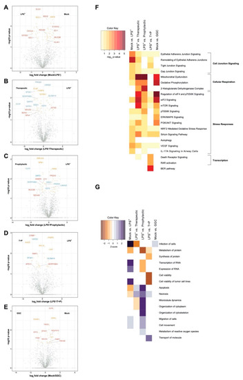 Ingenuity pathway analysis (IPA) [32] of canonical pathways, networks, and biological functions of differentially abundant proteins in each comparison pair was examined (Figure 2F and Table S4). Altered canonical pathways in the LPS-challenged comparison include oxidative and inflammatory responses such as “NRF2-mediated oxidative stress signalling” and the “IL-17A cytokine signalling pathway”. In both therapeutic and prophylactic treatment comparisons, enriched canonical pathways were related to cellular respiration, protein synthesis, and stress adaptation responses. These same pathways were enriched in the cells treated with GGC alone. Enriched pathways in the T+P condition were involved in the prevention of apoptosis, activation of transcription, and stress response (Figure 2F).