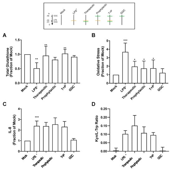GGC ameliorates LPS-induced reduction in intracellular glutathione levels and increase in cellular oxidative stress levels, but not LPS-induced inflammatory and immune regulatory responses. Cells from mock, LPS+, therapeutic (T), prophylactic (P), pre and post LPS+ treated (T+P), and GGC only conditions were assayed for (A) total intracellular glutathione, (B) oxidative stress levels, (C) IL-8 cytokine, and (D) IDO-1 activity measured as the kynurenine to tryptophan ratio. Statistical analysis was performed using two-way ANOVA against LPS+ for therapeutic, prophylactic and T+P conditions, and mock for LPS+ and GGC only (* = p < 0.05, ** = p < 0.01, *** = p < 0.001). Error bars represent SD. Data are from four cystic fibrosis (CF) derived differentiated airway epithelium cultures with three technical replicates for each different experimental condition.
