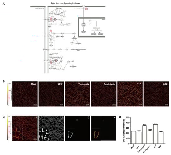 Reduction of tight junction protein ZO-1 by LPS challenge was ameliorated with GGC. Mock, LPS+, therapeutic (T), prophylactic (P), pre and post LPS+ treated (T+P), and GGC only conditions were assessed for tight junction protein ZO-1 expression. (A) Tight junction signalling pathway. Red highlighted proteins were more abundant in LPS+ relative to the mock, while green was less abundant in LPS+ relative to the mock. The pathway was adapted from IPA (QIAGEN). (B) Representative image of ZO-1 immunofluorescence in the six experimental conditions. (C) Summary workflow of ZO-1 quantification. The mid-plane of acquired z-stack images (plane with the highest intensity) were determined (panel 1) and used to generate the binary mask of tight junctions (panel 2). The junction of individual cells was extracted (panel 3) and the mid-plane intensity of pixels spanning the entire cellular junction was used to calculate the average intensity and standard deviation of intensity within each cell (panel 4). (D) Mean ZO-1 intensity as calculated using the above workflow. Data are from four cystic fibrosis (CF) derived differentiated airway epithelium cultures. Statistical analysis was performed using one-way ANOVA against LPS+ for T, P, and T+P conditions, and mock for LPS+ and GGC only (**** = p < 0.0001). Error bars represent SD. Scale bars represent 20 µm.