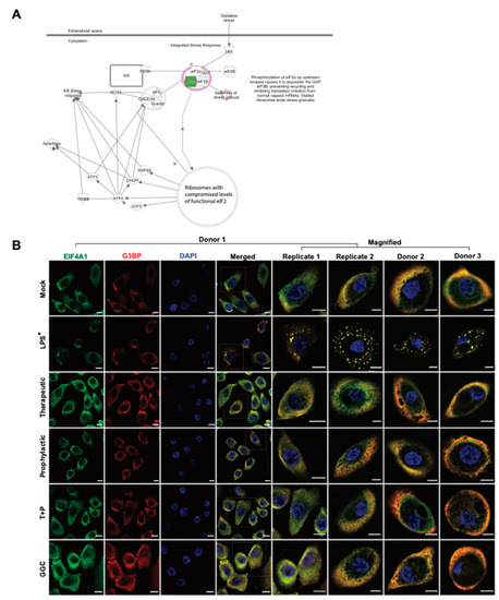 Protein synthesis pathways involved in stress response adaptation were enriched in the differentiated airway epitheliums treated with GGC (Figure 2F and Figure 5A). Differentially abundant proteins in these pathways included G3BP, EIF2S3, EIF3G, and EIF4A1 (Figure 2). These proteins are well-characterised markers of cytosolic stress granules (SG). These granules form when translation initiation is stalled [38]. With the limitation of primary bronchial epithelial proliferation capacity, and since nasal epithelial cultures have been established as an appropriate surrogate for studying lower airway inflammation [39,40] assessment of stress granule formation was carried out in nasal epithelial cultures (HNEC) generated from the same four CF donors. To confirm whether SG formation is modulated by GGC, we assessed the co-localisation of two SG protein markers, G3BP and EIF4A, in cells (Figure 5B). G3BP and EIF4A were seen in a small fraction of cells in all conditions, but they only co-localised in the LPS-challenged cells at low frequency (22% ± 8% cells). Therapeutic treatment of GGC completely ameliorated SG formation. Prophylactic and T+P treatment also prevented LPS-induced SG formation.