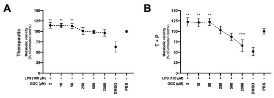 GGC increases the metabolic viability of LPS-challenged human airway epithelial cells. Cell metabolic viability was assessed in (A) post-LPS+ treated (therapeutic) and (B) pre and post LPS+ treated (T+P) conditions in cystic fibrosis (CF) human airway epithelial cells (HAEC) using the MTT assay. GGC treatment in a range of concentration (2 to 2000 µL) were tested. DMSO used as positive cell death control. Statistical analysis was performed using one-way ANOVA against LPS challenged cells. (** = p < 0.01, **** = p < 0.0001). Error bars represent SD. Data are from independent experiments performed on CF airway epithelium cultures from three primary human nasal epithelial cells and two immortalised human bronchial epithelial cells, with three technical replicates for each different experimental condition.