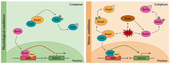 Upon oxidative conditions or elevated concentrations of heme, although under certain circumstances both situations might be equivalent since heme is a pro-oxidative molecule and oxidative stress may lead to heme release from hemeproteins [21], the repression exerted by Bach1 is relief [32]. Heme binds to Bach1 heme binding sites, inducing Bach1 conformational modifications. These changes prevent Bach1 binding to StREs and lead to Bach1 export from the nucleus, and its ubiquitination by E3 ubiquitin ligase HOIL-1 and proteosomal degradation [32,34]. In addition, oxidative stress may also release the HO-1 repression by Bach1 through oxidation of its sulfhydryl groups [35]. On the other hand, when the cells are subjected to oxidative stress, Keap1 undergoes a conformational change which results in Nrf2-Keap1 dissociation and Nrf2 translocation to the nucleus where it interacts with small Maf proteins, and binds to StRE, promoting HMOX1 expression [30]. Prolonged exposition to oxidative stress results in Keap1 ubiquitination and proteosome-independent degradation [36] (Figure 1).