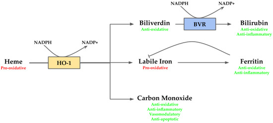 Heme is an essential molecule since it works as a prosthetic group for several hemoproteins, such as hemoglobin, cytochrome c oxidase, and peroxidases. However, in its free non-protein bound form, it is highly toxic. In this form, heme acts as a pro-oxidant molecule provoking oxidative damage via ROS generation [21]. In addition, the oxidative damage may trigger heme release from hemoproteins, which in turn may contribute to boost the oxidative state [21]. Along with its pro-oxidant properties, heme also exhibits pro-inflammatory behavior which contributes to cellular stress [42]. Given the adverse environment to the cells generated by heme, its removal is necessary to maintain homeostasis within the cell. This reaction is mediated by HO-1, releasing biliverdin/bilirubin, CO, and labile iron. These by-products also act as cytoprotective agents. The bile pigments biliverdin/bilirubin act as potent antioxidants [43]; CO exerts anti-apoptotic, anti-inflammatory and vasomodulatory activities [44]; and labile iron, which exerts anti-inflammatory function via ferritin [45], although also may produce deleterious effects since it is pro-oxidative [46] (Figure 2).