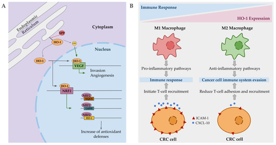 Mechanisms by which heme oxygenase 1 (HO-1) may contribute to cancer progression. (A) Signal peptidases (SPPs) mediate HO-1 compartmentation to the nucleus, where it regulates the expression of vascular endothelial growth factor (VEGF), promoting angiogenesis and invasion. CO, in a tumorigenic environment, may also promote the same previous effect. HO-1 also regulates nuclear erythroid 2-related factor (Nrf2) expression, which in turn regulates the expression of antioxidant enzymes such as HO-1, G6PH, and NQO1, enhancing the antioxidant capacities of the tumor cells. (B) HO-1 expressing macrophages are polarized into M2 state, promoting anti-inflammatory pathways and facilitating cancer cell to evade the immune system. In colorectal cancer (CRC) cells, the overexpression of HO-1 results in low levels of ICAM-1 and CXCL-10, reducing T-cell adhesion and recruitment.