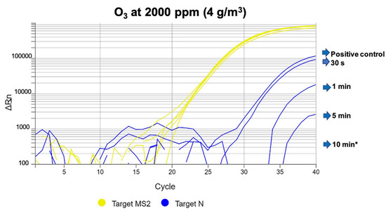 Severe acute respiratory syndrome coronavirus 2 (SARS-CoV-2) (N gene amplification) detected in PPE gown samples after ozone exposure at 2000 ppm (4 g/m3) after 30 s, and 1, 5, and 10 min. The image shows a relationship between increase in exposure times and progressive decrease in gene amplification, with increasing threshold cycle values. * No gene amplification was detected at 10 min of exposure.
