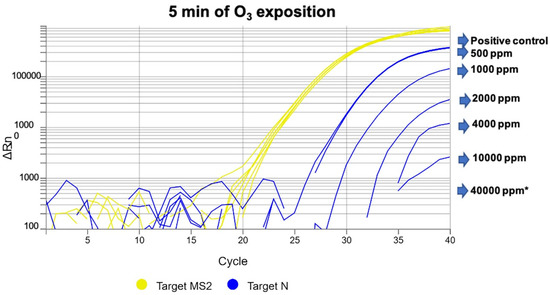Ozone exposure at 1000 ppm (2 g/m3) and 500 ppm (1 g/m3) for 5 or 10 min resulted in viral gene amplification in PPE gowns and face masks. Figure 3 shows gene amplification detected after 5 min of exposure at different ozone concentrations.