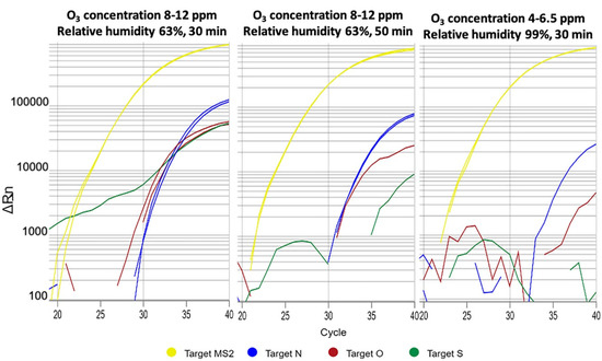 After 30 min in the ozonation chamber with exposure at 8–12 ppm (0.016–0.024 g/m3) under 63% relative humidity, virus gene amplification was detected in PPE gowns and face masks. When the time was increased to 50 min, the virus was still present, although a decrease in all gene amplifications was observed. In the ozonation chamber with exposure at 4–6.5 ppm (0.008–0.013 g/m3) under 99% relative humidity, SARS-CoV-2 was completely eliminated from PPE gown samples after 30 and 50 min. However, gene amplification was present in face masks after 30 and 50 min (Figure 4).