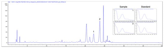 C. junos Tanaka, which is primarily consumed as thin slices of its peel, contains abundant vitamin C and flavonoids, such as hesperidin, quercetin, tangeritin, and naringin [26,27,28]. Particularly citrus flavanone glycosides, such as naringin and hesperidin, are the most abundant compounds in CE, and they are increasingly being recognized as key compounds for its role in antioxidant activities by conferring protection against oxidative stress-induced cellular damage [17,29]. Hence, the established chromatographic conditions were applied for the simultaneous determination of the main constituents in CE. With respect to the high performance liquid chromatography (HPLC) analysis, CE was standardized based on naringin and hesperidin, which is reported as a major bioactive antioxidant compound in CE [16,17,30]. As illustrated in Figure 1, naringin and hesperidin were identified as a major component of 50% ethanolic CE, as indicated by the comparison to the retention time (naringin: 22.2 min; hesperidin: 23.9 min) and absorption profile of its reference standard, and the results confirmed that CE contained 4.72 mg/g naringin and 7.53 mg/g hesperidin. [31].